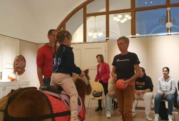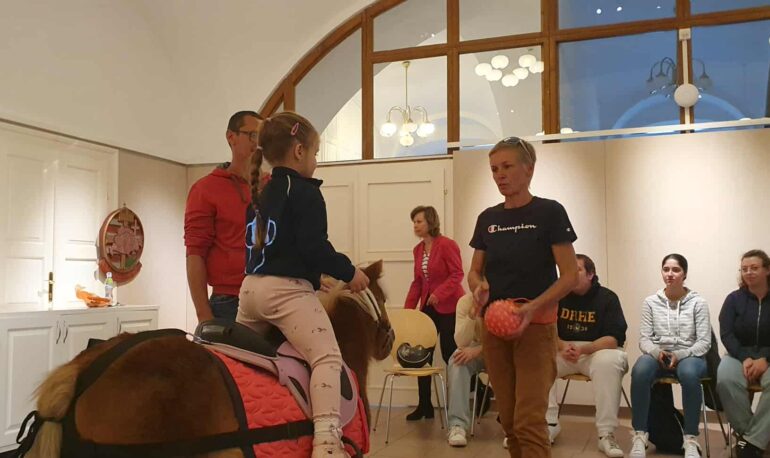 A gyakorlati bemutató során Maja – a készségi és engedelmességi vizsgával rendelkező, vizsgázott iskolaló – és tündéri kis lovasa , Lotti mozgásfejlesztő (nagymozgás, finommotorika) gyakorlatokat mutattak be. Majd a közönség bevonásával csoportos, lóasszisztált mesefeldolgozás következett, ahol biológiai, etológiai ismeretekkel és részképességek fejlesztésével gazdagodhattak a résztvevők.
