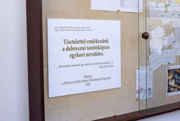 A Kölcsey Ferenc Tanítóképzési Intézet oktatóinak régi vágya egy emléktábla elhelyezése az épületben, ami más pedagógusképző intézményekhez hasonlóan az elődök tevékenységének kíván emléket állítani. A Pedagógia és Pszichológia Tanszék hirdetőfelületén elhelyezett ideiglenes tábla avatását helyeztük ünnepségünk középpontjába, amit a gyakorlóiskolánk alsós diákjai által készített rajzokkal, grafikai szervezőkkel és haikukkal egészítettünk ki, melyek erre az alkalomra készültek, s két 2. évfolyamos, tanító szakos hallgatónk, Szabó Petra és Szabó Valéria olvasta fel őket. A hallgatóság között mind egyetemünk polgárait, mind a Kölcsey Ferenc Református Gyakorlóiskola pedagógusait és tanulóit üdvözölhettük, sőt nagy örömünkre néhány nyugalmazott kollégánk is megjelent körükben.