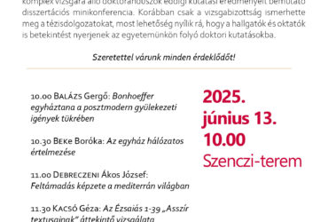 A Doktori Iskola szervezésében első alkalommal kerül megrendezésre a doktori komplex vizsgára álló doktoranduszok eddigi kutatási eredményeit bemutató disszertációs minikonferencia. Korábban csak a vizsgabizottság ismerhette meg a tézisdolgozatokat, most lehetőség nyílik rá, hogy a hallgatók és oktatók is betekintést nyerjenek az egyetemünkön folyó doktori kutatásokba.